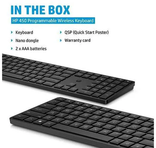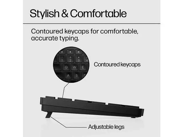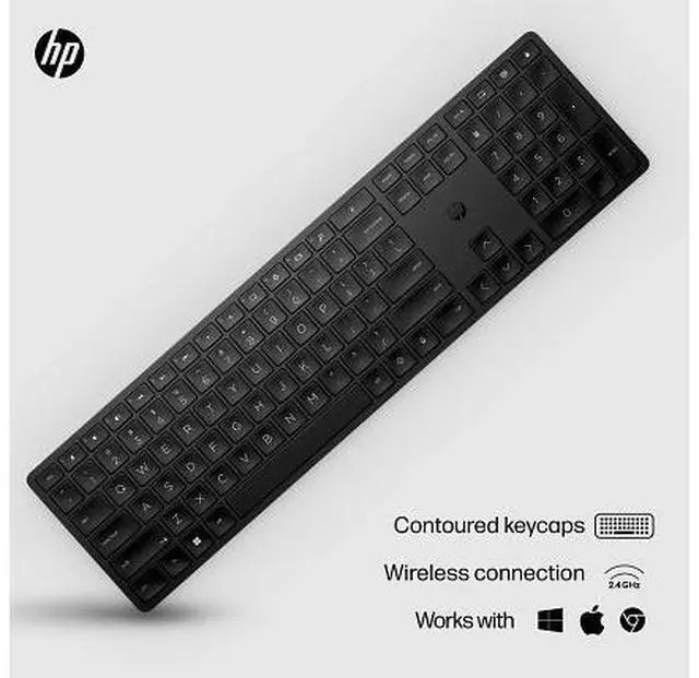 OverviewNow you can get everything you want in a wireless keyboard comfort, productivity, reliability and style. Customize the functions of 20+ keys to work faster and smarter. Made with sustainably-sourced materials, it's also easy to keep clean and sanitary. What's in the box? Wireless keyboard; USB dongle; 2 x AAA batteries; Quick start guide; Warranty card; R. E. D. Card (EMEA only) Disclaimers Requires HP Accessory Center (HPAC) Software. HPAC available for free download in Microsoft Store or Apple Store. Recycled plastic content percentage is based on the definition set in the IEEE 1680.1 -2018 EPEAT standard.