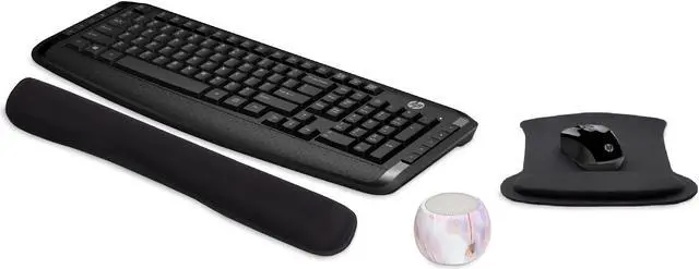 HP Wireless Keyboard & Mouse 300 PC Accessories Bundle with Gel Pads & Boost Bluetooth Speaker is made to maximize your computer productivity & sound quality during work, school, vacation, or travel.