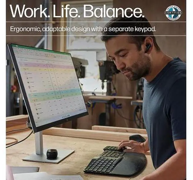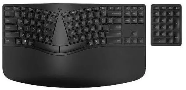 OverviewBuild a space that works for you with the scientifically-designed HP Ergonomic Wireless Keyboard. The split-zone layout adapts to you, while twenty programmable keys and a separate numeric keypad offer total customization. And with two ways to connect devices, you can work assured you've got the right tools for the task. What's in the box? Wireless keyboard; USB dongle; 2 x AA batteries; Quick start guide; Warranty card; Wireless numpad; 2 x CR2032 batteriesDisclaimers Only select keys are programmable on the keyboard, not on the numpad.