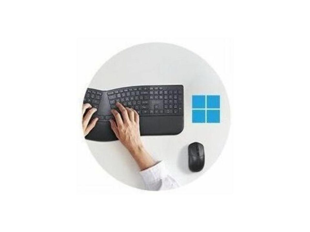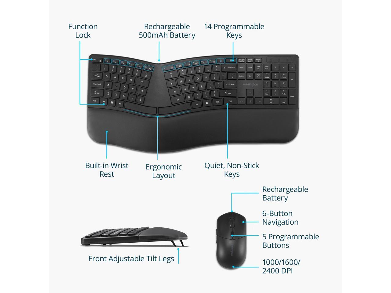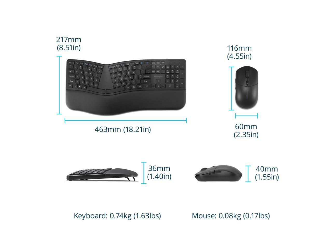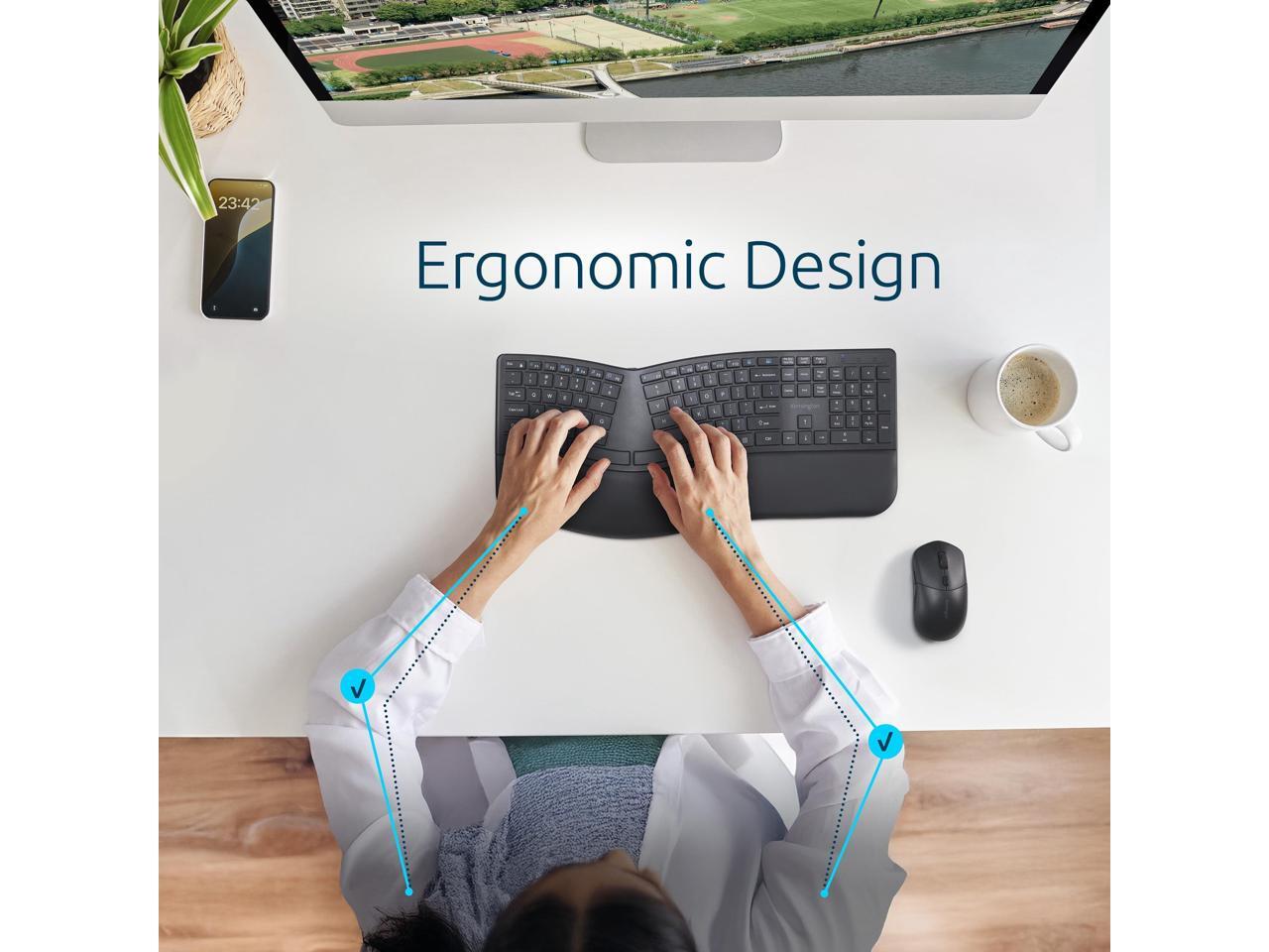 Kensington Pro Fit Ergo KM680 EQ Rechargeable Desktop Set - USB Type A Wireless Bluetooth/RF 5.4 2.40 GHz Keyboard - Black - USB Type A Wireless Bluetooth/RF Mouse - Optical - 2400 dpi - 6 Button - Bl