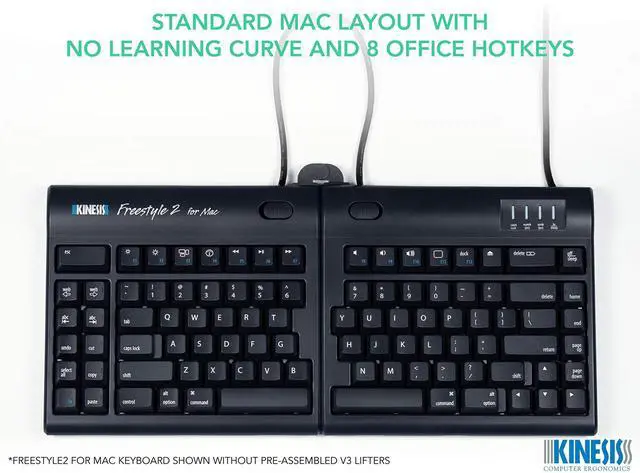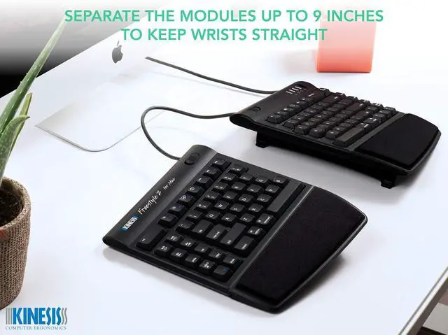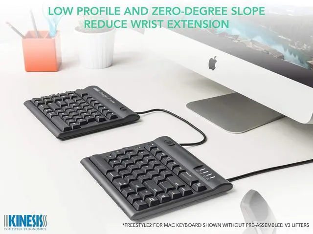 Most keyboards including ergonomic models have a 10 degree positive slope from front to back. These designs tend to bend your wrists. The Freestyle2 has a zero degree slope which minimizes the height, effectively creating negative slope and reducing wrist extension. The slim design provides a 2-in-1 office and travel keyboard.