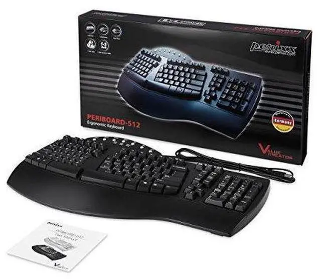 Brand: PerixxColor: BlackFeatures: Split-key and 3-D design conforms to your natural arm and hand positions. Integrated palm rest design support your wrists a comfort position. Recommended for repetitive strain injuries (RSI) usersThe tactile keystroke is designed in order to reduce pressure when you press the keys and to give you the benefit to type more comfortablePlug and Play keyboard with USB interface and 6.0 Ft cable; Build-in with 7 Multimedia Hot keys.System requirements: Windows 7 8 10; Wired USB connection; Package includes: PERIBOARD-512Operating System: windows 7Publisher: Perixx Computer GmbHWarranty: 2 Years Limited WarrantyDetails: Wired ergonomic keyboard. Full size and ergonomic split design guide you to the most relaxing typing gesture. The best-selling keyboard from Perixx ergonomic family.EAN: 4049571001715