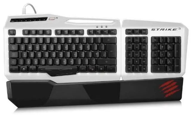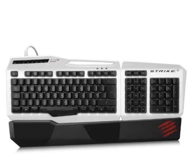 Available in your choice of 3 colors Mad Catz S.T.R.I.K.E. 3 Gaming Keyboard for PC The PC Gamer's Ally Mad Catz' S.T.R.I.K.E. 3 Gaming Keyboard is an ideal entry into the world of competitive gaming. Whether your game of choice is an FPS, RPG, MMO, RTS, MOBA or any other genre, precise key response, customizable backlighting, and programmable macro keys all help give you an advantage over the competition. When used in conjunction with a member of Mad Catz' lineup of award-winning R.A.T. gaming mice, you'll have all the inputs you need to play at your very best. Key Membrane Optimized for Responsiveness When a fraction of a second is all that divides victory from defeat, you must have absolute confidence in your gaming keyboard. The custom-crafted P.U.L.S.E. key bed employs a specially engineered membrane tuned to provide precise tactile feedback and five times the durability of traditional keyboards. Speedy, double-tap friendly keys respond to an optimized 60g of actuation force and reset at the perfect level, all of which helps reduce muscle fatigue during sessions of prolonged gaming. And, S.T.R.I.K.E. 3 has anti-ghosting capabilities for up to seven simultaneous keystrokes. Fully Customizable RGB Backlighting Not all backlighting is equal. RBG backlighting with 16 million color variants both through and around the keys matches the keyboard to your gaming rig and the keys' laser-etched, lacquered light guides are ideal for gaming in dim environments. Custom, extra-bright backlighting colors also provide convenient 'at-a-glance' status indication for each of the keyboard's three modes. 12 Programmable Macro Buttons The S.T.R.I.K.E. 3 Gaming Keyboard incorporates a dozen programmable macro buttons over three modes to create 36 user-definable commands. Each of the three modes can store your programmed macros, tripling mid-game access to available commands. Once programmed, custom profiles can be published to share with your community and saved for later recall, allowing for a seamless transition to another gaming PC. Uncomplicated Macro Programming An intuitive graphical interface vastly simplifies the formerly tedious task of macro programming. Assign single or multiple keystrokes complete with custom timings to macro keys and then easily fine-tune your settings. This ability is essential for fast-paced games which require clear but complex multi-key actions. Conveniently Placed Shortcut Keys Integrated shortcut keys provide the means to adjust media and backlighting without the need to open apps or programs. Quickly and easily pause or skip music tracks, tweak the volume, and alter backlighting brightness all from buttons F5 though F12. Speedy, double-tap friendly keys respond to an optimized 60g of actuation force and reset at the perfect level, all of which helps reduce muscle fatigue during sessions of prolonged gaming. And, the membrane has anti-ghosting capabilities for up to seven simultaneous keystrokes. Windows Key Lock Accidentally pressing the Windows key during an intense game can result in losing rather than winning. You have the power to completely disable the Windows key by merely sliding a switch. Product Includes: S.T.R.I.K.E. 3 Gaming Keyboard Removable Wrist Rest Product Specifications: Windows 8, 7, Vista, XP, and XP (64- or 32-bit)