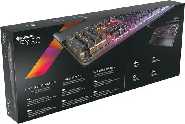 Mechanische Schalter mit 2,0 mm Auslösepunkt (rot) und Advanced Anti-Ghosting-Technologie Oberseite aus gebürstetem Aluminium AIMO Lichtsystem Abnehmbare Handballenauflage Doppelte Tastenbelegung mit ROCCAT Easy-Shift