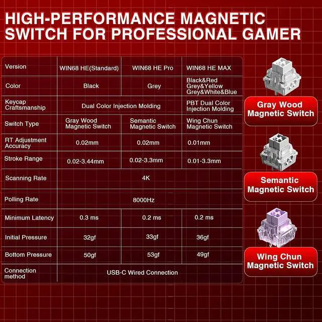 Hall Effect Keyboard with Magnetic Switch: Equipped with advanced hall effect magnetic switches, the WIN68 HE MAX gaming keyboard offers adjustable actuation point( 0.01 mm- 3.3 mm), and each key can be personalized to the smallest unit of 0.1 mm, providing an ultra-precise keying experience. In addition, press/reset sensitivity can be individually set via software to match the keystroke habits of different people in different types of games