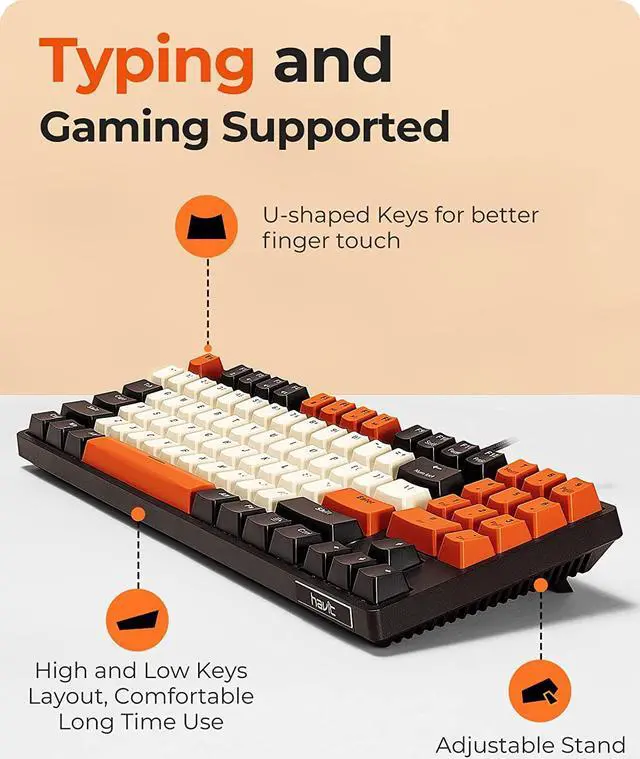 Ergonomic ComfortThe design of this mechanical gaming keyboard is based on ergonomics, the two keyboard kickstands provide comfortable angle for typing and effectively reduces the burden on the wrist.
