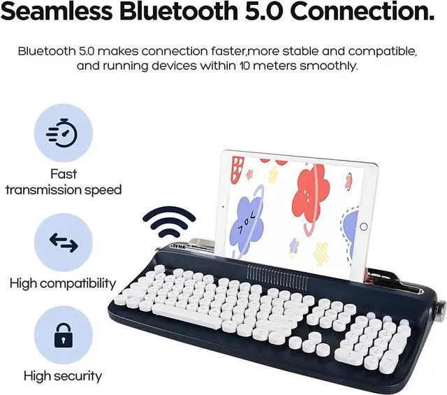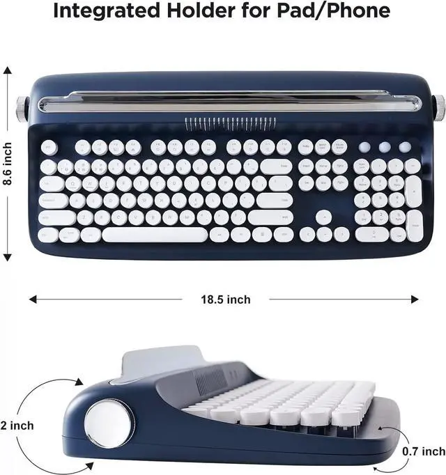 TYPEWRITER KEYBORD WITH INTERGRATED STAND: The wireless keyboard designed with integrated stand holder to match the desk aesthetic and more space-saving. The keyboard also includes adjustable button feets that can ensure the comfortable long time typing. The built-in tablet phone pad holder is 17.8 inch in length and 0.59 inch in width.