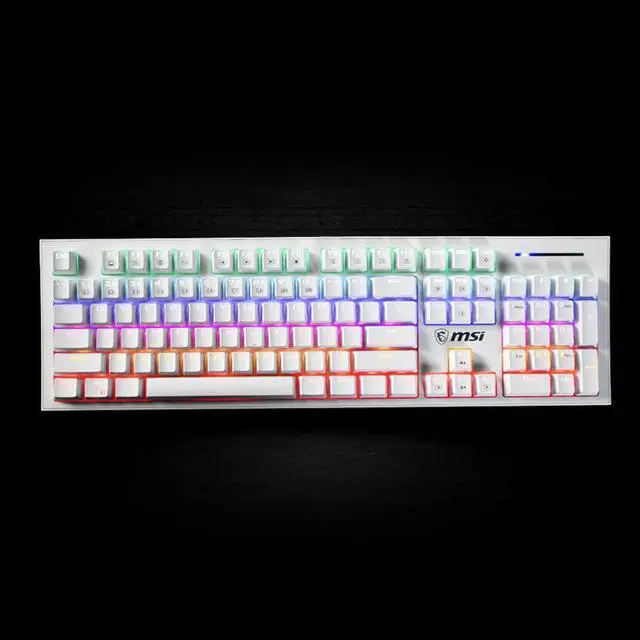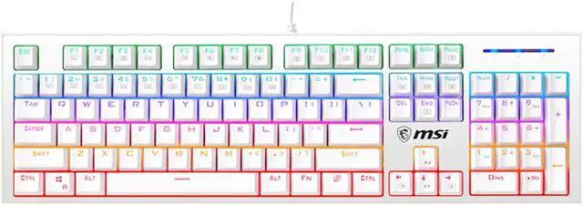 Keys White Features: Blue mechanical switches provide speed, accuracy, and endurance Slim and lightweight design complete the stylish appearance of MSI Mechanical Gaming Keyboard GK50Z The ergonomic high-low keycap design reduces strain and pain of hands and wrists Stunning per-key RGB lighting and various effects Steady Gaming Base provides incredible feedback and anti-slip performance