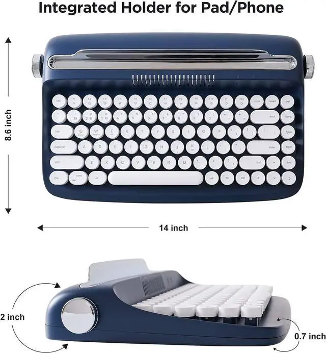 VINTAGE TYPEWRITER KEYBOARD WITH INTEGRATED STAND: The YUNZII actto B303 wireless typewriter keyboard includes an integrated stand holder for pad, phone and tablet, which matches the aesthetic of your desk and saves space. The wireless mini compact also includes adjustable feet, allowing you to set the angle for maximum comfort during long typing sessions. The built-in tablet or phone holder is 12.9 inches long and 0.59 inches wide.