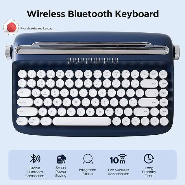 MULTI-DEVICE WIRELESS KEYBOARD FOR MULTI OS: The wireless office retro keyboard connect via Bluetooth on Windows, Android or iOS systems, Support all kinds of devices including Pad/PC/Laptop/Tablet/Smartphone. The package include a retro wireless keyboard, an extra red keycap, 2 AAA batteries, manual.