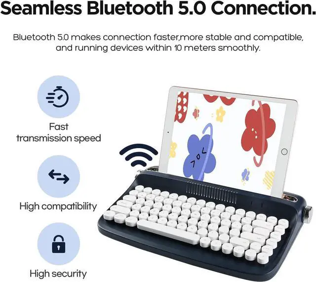 BLUETOOTH CONNECTIVITY: The B303 typewriter bluetooth keyboard features the latest Bluetooth 5.0 technology, providing a stable and cable-free connection with a range of up to 33 feet (10 meters) without any delays. You can easily switch between up to three devices with the touch of a button, FN+1/2/3.
