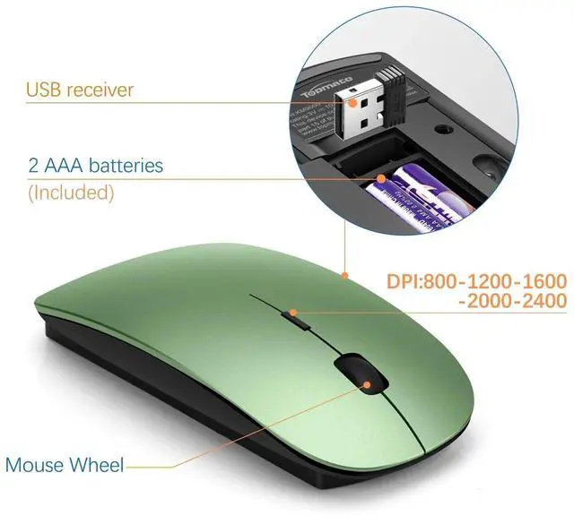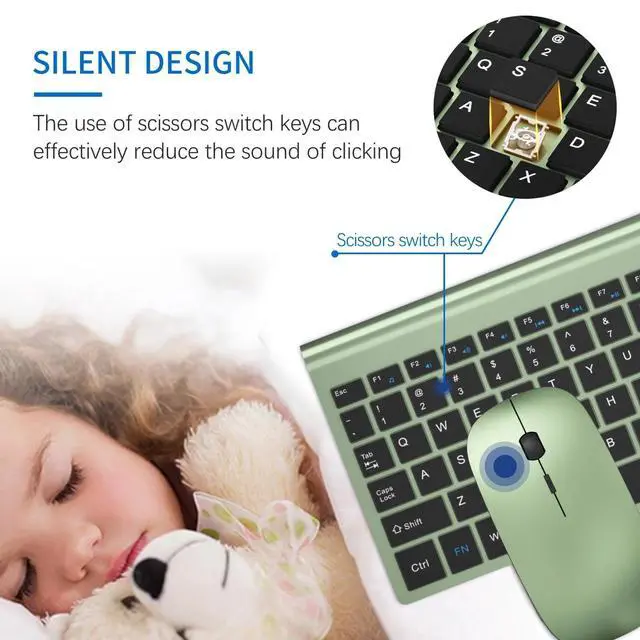 Silent KeyboardThe wireless office keyboard s scissor switch keys provide less noise. Light and responsive tactile keystroke makes typing soft and comfortable. Silent cordless mouse has 5 DPI levels (800/1200/1600/2000/2400). It is fast and precise, keep quiet while maintaining sensitivity. Never worry about disturbing others to rest while working or playing.