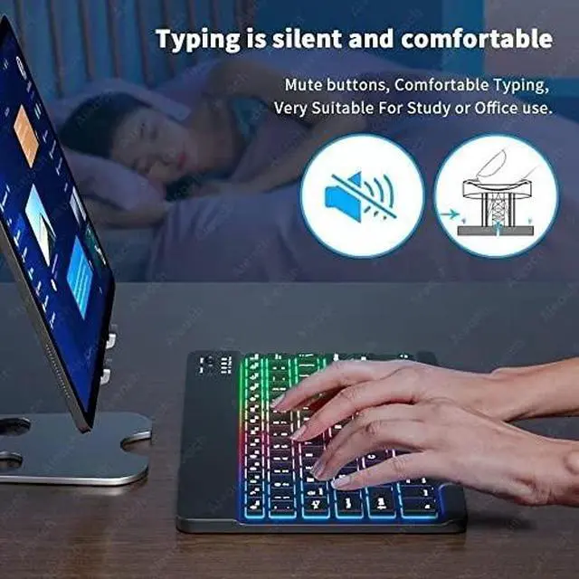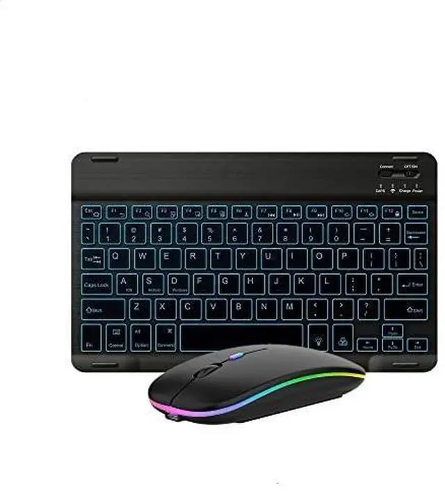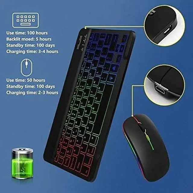 - 7-Color LED Backlit - This wiressless 7-color led backlit bluetooth keyboard and mouse adopts bluetooth wireless connection and scissor key structure,which bring you a perfect input experience,it has built in rechargeable polymeric lithium better and charging indicator,the keyboard will enter into sleeping mode if there is no action in 10 minutes,therefor it has a small comsumption and long battery life.