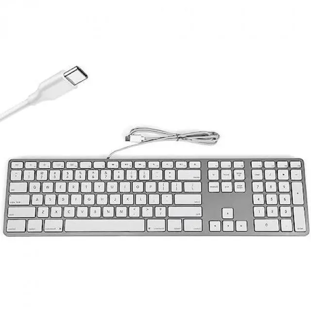 The Matias USB-C Keyboard for Mac is for people who miss Apple's wired USB keyboard. Many people still like the reliability of a traditional USB connection and numeric keypad. This keyboard by Matias has all the special Mac functionality you expect on the function keys, with the traditional full size keyboard layout. This keyboard has a USB-C connection. This model has a plastic keyframe, and does not have a USB hub, so is a budget version of our higher end wired aluminum model.