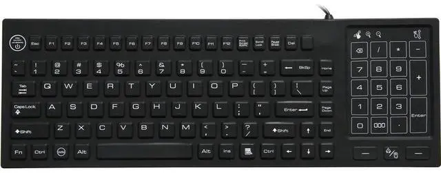 The IKB700BL is a LED Backlit silicon keyboard with an integrated 2-1 touchpad and number pad. IP68 rated for indoor/outdoor use, protecting from water, dirt and other environmental conditions.