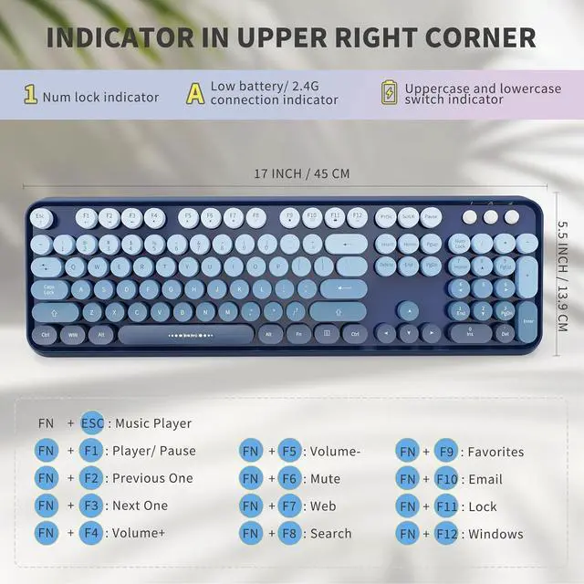 • Auto-Sleep FeatureThe retro typewriter keyboard with auto sleep mode that activates after 30 Mins of inactivity. The full-sized Keyboard runs on two AAA batteries, the cute mouse runs on one AA battery (Both Not Included). Low battery indication shows in the top right corner, when the battery is dying,the blue keyboard's low battery indication light will remind you to replace the battery. 13 Multimedia Hot KeysThis cute keyboard and mouse wireless with 104 keys, including 13 convenient shortcuts and a numeric keypad. The 13 multimedia hotkeys with symbols underneath, making it easy for people to check the function of each keys, combined with FN provide a shortcut to your music, emails, movies, web, ect, improve your working efficiency. Ergonomic Silent Mouse with 3 DPI The aesthetic cordless mouse features a big or small hand-friendly contoured shape for all-day comfort, and smooth, precise tracking and scrolling for easier navigation. Perfect for home & office work and entertainment. The cute Optical mouse is with modern ergonomic design, 3 adjustable DPI (800-1200-1600) to meet your daily needs, silent click allows you to focus on your work without worrying about disturbing others.