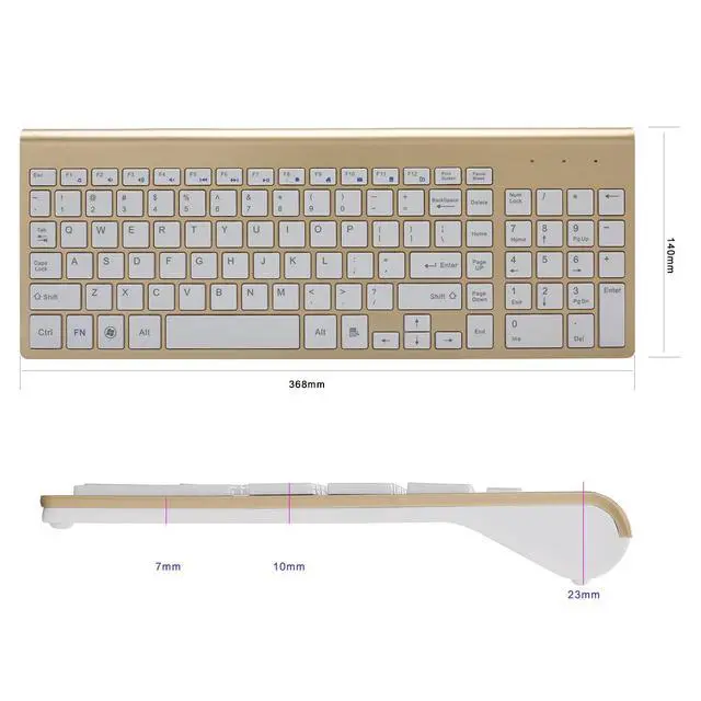Compatibility: Compatible with operating systems range from Windows 98/ Windows 2003/ XP/ Vista/ Win7/ Win8/Win10; Supports connection with the devices that have USB interface, for example, PC, desktop computer, smart TV and others. Product Specification: Type: Wireless Set With the computer connection: keyboard wireless, mouse wireless Keyboard Interface: Wireless Mouse interface: Wireless Work: Photoelectricity Photoelectric resolution: 1200dpi Wireless Standard: 2.4GHz Keyboard Size: 370 142 9mm Keyboard Weight: 400G Key Lifespan:5 million cliks Connectivity Range: 10M Number of Channels: 16 USB Interface: 1.1-2.0 Radio-frequency Power: 3db Temperature: -40 - +85 Degree Centigrade Battery: Two AA size batteries (Not included) Current: 5mA Voltage:3V Whether to support plug and play: support Is there a multimedia function key: Yes Whether to support ergonomics: support Features: ultra-thin mute Applicable to: home, games, notebook, office use Packing List: Mouse 1 Keyboard 1 USB Nano Receiver (In the battery compartment of the mouse) 1 Note: Please feel free to contact us if this item you bought encountered problems, we would provide you the best customer-service including changing a new replacement or refunding you.Description