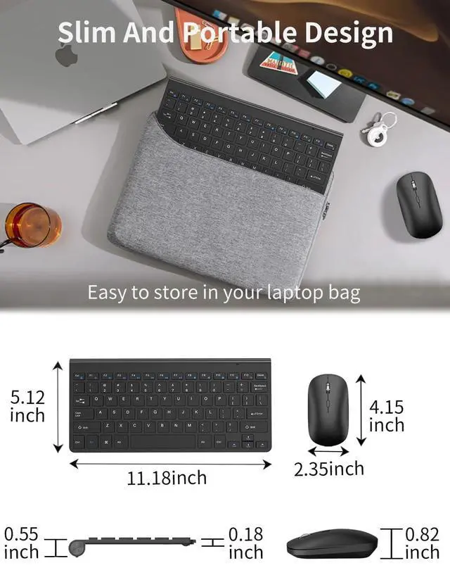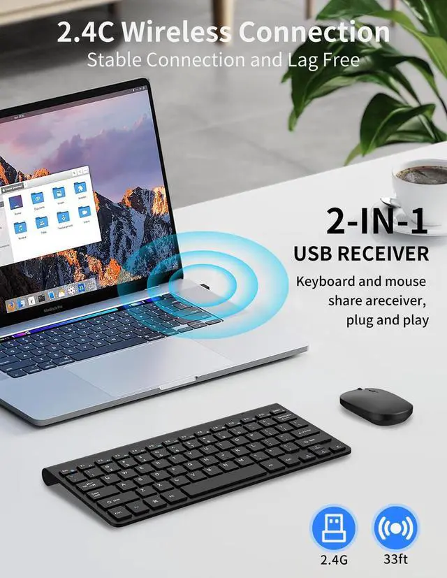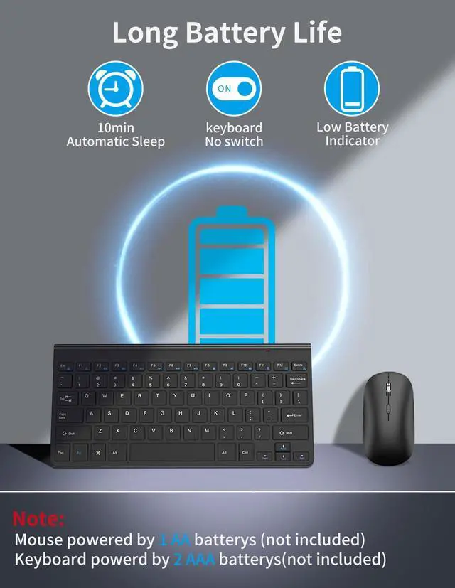 The wireless keyboard uses two AAA batteries, and the wireless mouse uses one AA battery.(Not included)