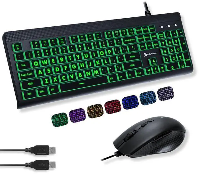 Wired Keyboard and Mouse Combo - Easy to See Backlit Large Print Keyboard Mouse for PC and Windows with 107 Light Up Keys, 7 Color LEDs, USB Wired, 4 DPI Modes