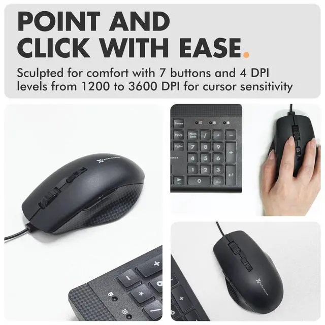 : This wired mouse and keyboard combo has 4 speed settings - slow for precise clicks, fast for screen movement. 7 buttons for forward, back & scroll