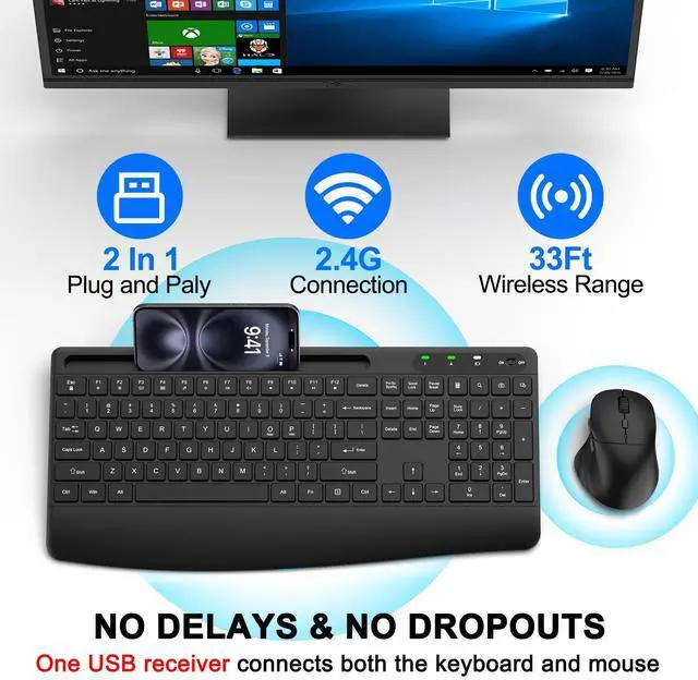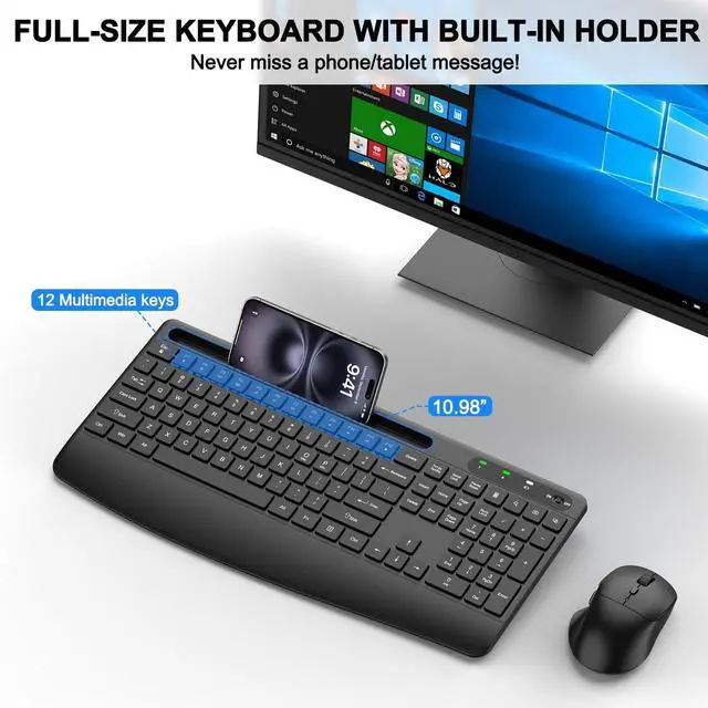 Keyboard and Mouse Combo with Device HolderThis wireless keyboard and mouse combo includes a full-size ergonomic keyboard with a built-in cradlewhen working with this wireless keyboard and mouse, youll never miss any phone messages. The holder props up your phone or tablet at a perfect angle for easy reading or video watching, making the keyboard and mouse wireless combo more convenient for multitasking.