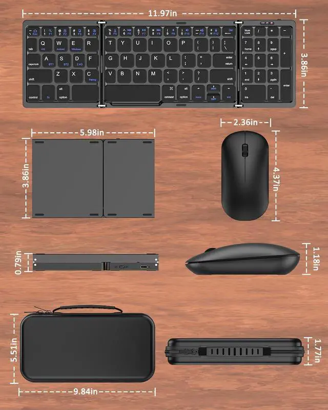 Pocket-Size & Hard Travel CaseThe mini-size wireless foldable keyboard and mouse combo is designed to save space, making it perfect for limited desktop areas. It comes with a stylish hard case and an adjustable phone holder, serving as the ideal companion for business activities and travel adventures, creating all kinds of whimsical ideas anytime, anywhere! Hard carry case size is: 25*14*4.5cm (9.84*5.51*1.77inches)