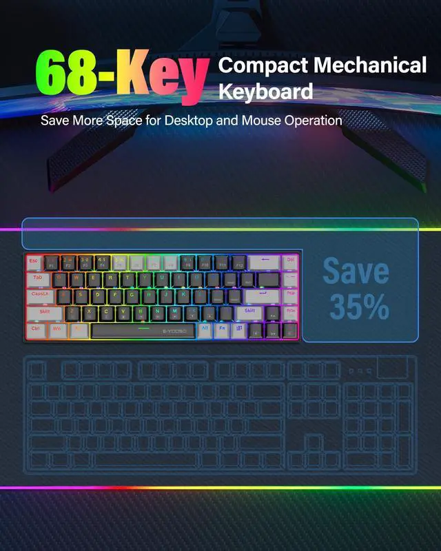 65% Compact Layout: This cute mechanical keyboard comes with 68 keys, and also with separate arrow keys, F1-F12, Fn function keys you need. It will greatly improve your efficiency in office work and multimedia creation.