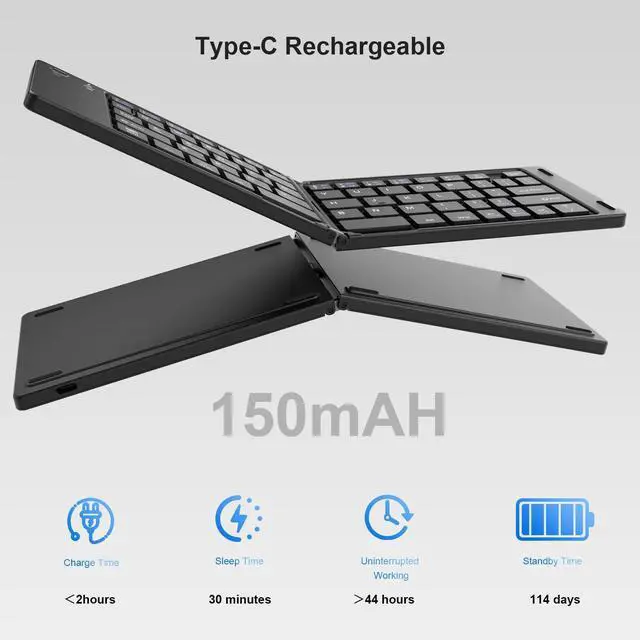 Long Battery Life The mobile keyboard is equipped with a rechargeable battery and On/Off switch. Easily recharged via the included Type-C cable. 2 hours full charge delivers up to 150+ days standby time, great for for working outside of office. Also has an auto-sleep feature, helps maximize the amount of use get from each charge.