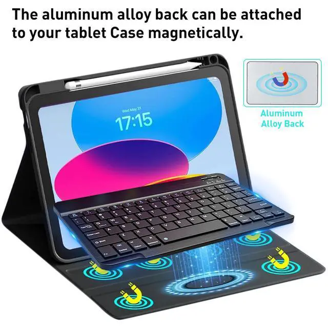 Ultra Slim Design with Light WeightThe keyboard has mini size and ultra slim design with light weight, keyboard size: 9.84 x 5.9 x 0.24 inch, weight: 6.35 ounce/0.4 pounds. The back of the keyboard has made of aluminum alloy material, which can be attached to your iPad magnetic case easily.It is perfect for iPad and tablets.