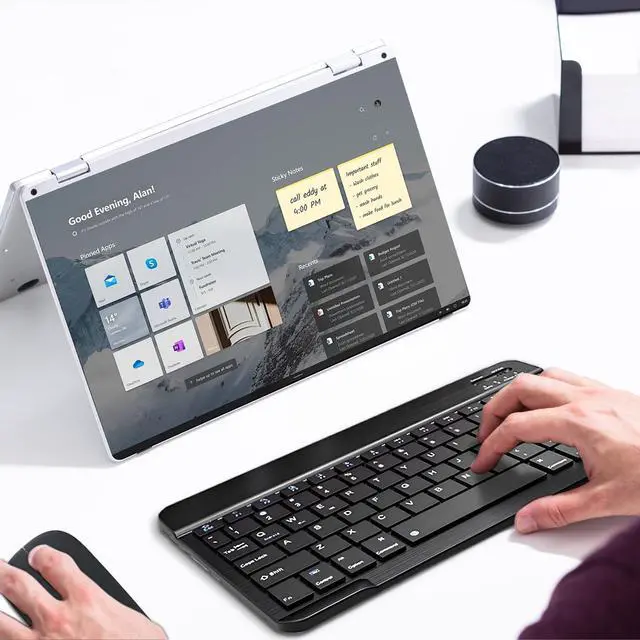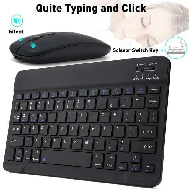 Quiet Typing & ClickThe bluetooth keyboard has built with quiet and responsive scissor switches low-profile keys, offering laptop-like efficiently typing with comfort and quiet.The mouse has soundless click design for quiet click.