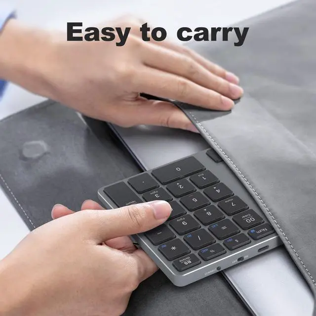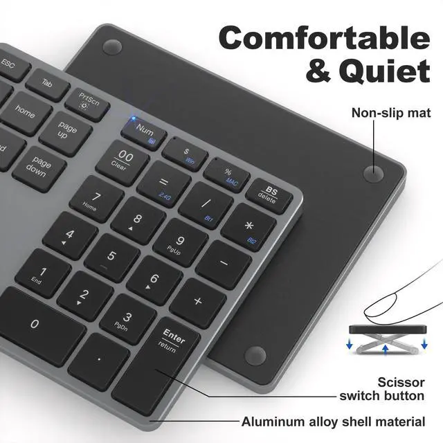Stable and Ultra-thin Aluminum DesignThe Bluetooth number keypad for laptop is made of a sturdy aluminum alloy bottom frame, the keys use a scissor switch key structure and a high-quality ABS top cover, soft pressing touch and ergonomic tilt, more comfortable typing and beautiful appearance, perfect match your Macbook, MacBook Air/Pro, iMac, PC, Surface Pro, laptop or desktop as a side external 10 key usb keypad.