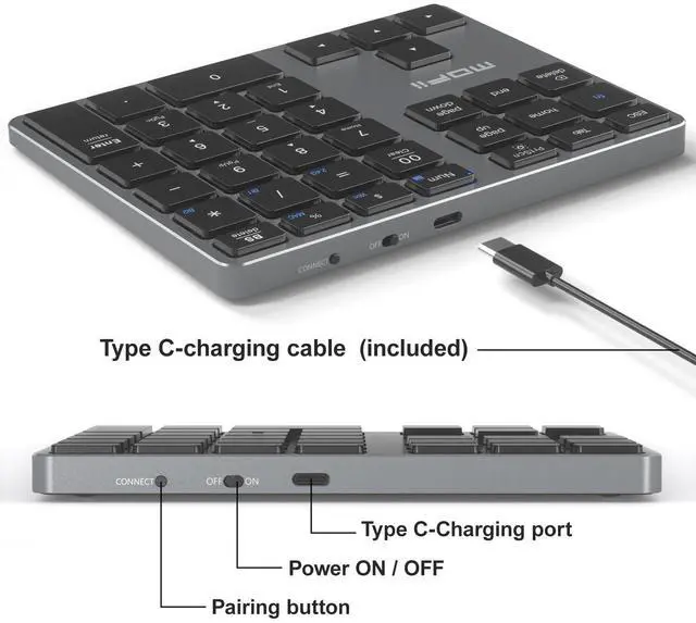 High Capacity Rechargeable Bluetooth Number KeypadWireless Numpad have 300mA rechargeable lithium battery to avoid frequent battery replacement. USB-A to USB-C charging cable is provided, and the data transmission speed is fast without delay and jamming. Perfect for financial accountants, students, offices and spreadsheet experts.