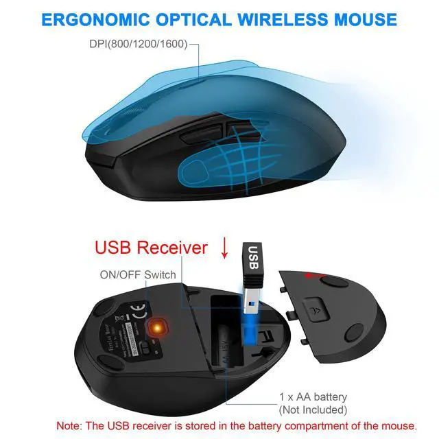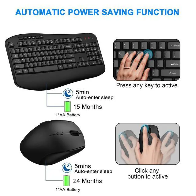 Long Battery Life: Idle for 5 min, keyboard and mouse wireless will sleep, clicking any keys to wake them up. Auto-sleep mode extends the battery life to more than 12 months. The computer keyboard and mouse each require 1*AA battery ( )