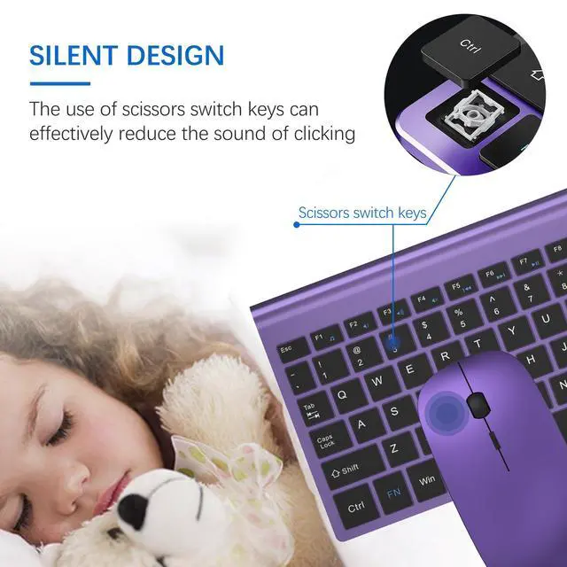 Wireless keyboard featuring silent scissor switches, providing you with a quieter typing experience. Mouse is also designed to operate silently, allowing you to work or play without disturbing others.