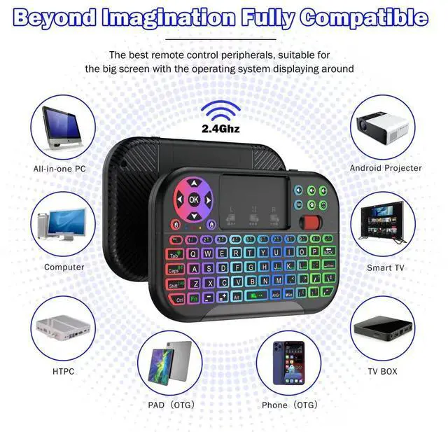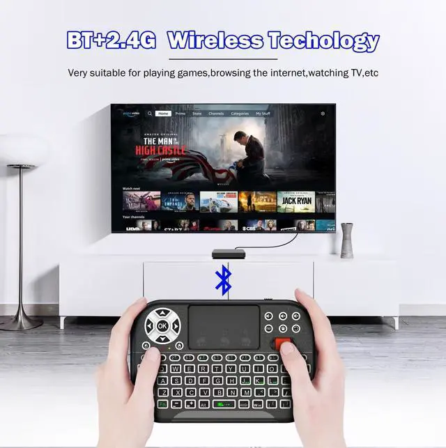 M2 mini wireless QWERTY keyboard connects via the included USB receiver or bluetooth for plug-and-play convenience. With its compact, Portable design and innovative styling, its ideal for android TV boxes, HTPC, smart TVs, and personal computers.