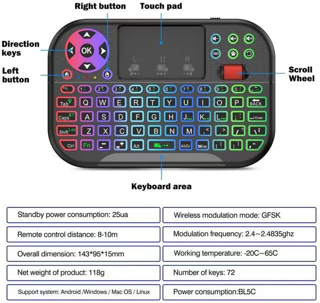 Wireless keyboard features 8-color RGB backlight, allowing for precise operation even in dark environments. It has an effective operating range of approximately 33 feet (10 meters) and supports multiple operating systems, including Android, Windows, Mac OS, and Linux.