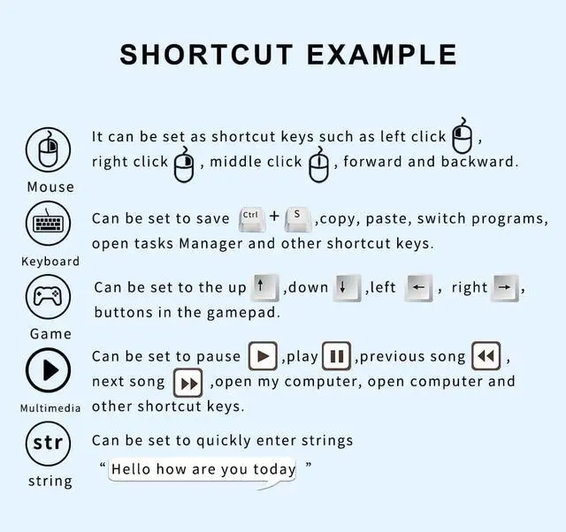 User-defined shortcut keys: FS23 is a HID USB programmable keyboard, it can be customized as a one-button, combination keys , shortcut keys, multimedia keys by provided software.