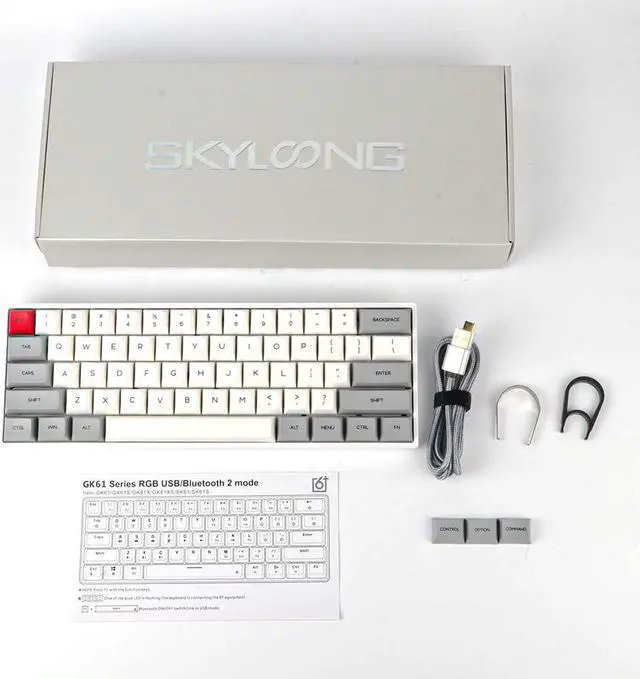 SK61S BLUETOOTH WIRELESSMECHANICAL KEYBOARDHotswappable mechanical keyboard3 layers fully programmable (Fn1+F2+Fn3)Bluetooth 5.1 wireless wired dual modeNKRO, PBT dye-sublimation keycaps16.8million RGB backlights, compatible with Mac&Win