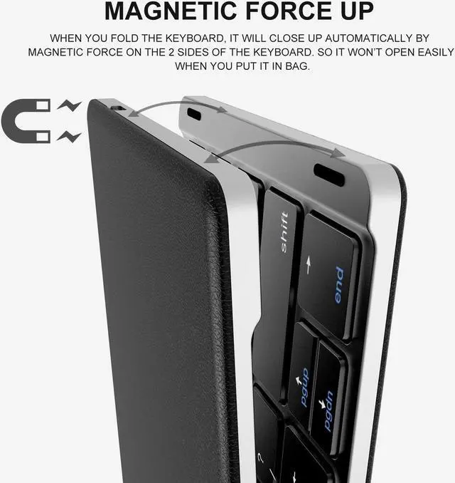 The keyboard features a lightweight, pocket-sized design. It is elegantly appointed with premium black leather exterior, gently snaps shut at the end of use with a magnetic closure, and easily fits into a laptop bag or a purse.