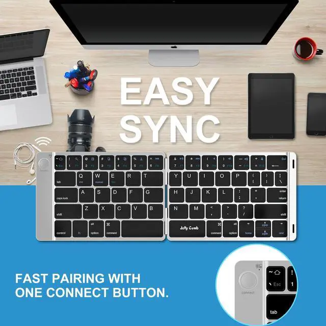 Pairing with your Bluetooth device is seamless. After fully charging the keyboard, it syncs with your Bluetooth device with one press of the connection key. After each use, simply fold it up and put it away. The magnetic closure prevents it from falling open during storage or transport. It is also equipped with automatic standby and sleep mode.