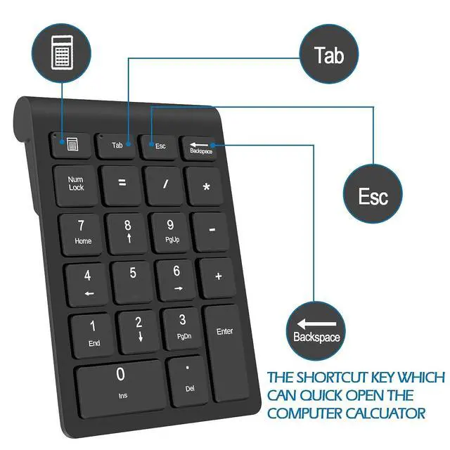 - 1.22-Keys Number Keypad: Numeric Keyboard Supports Numlock, Esc, Tab, Delete Etc. With Shortcut Key Which Can Open The Computer Calculator Directly. The Muli-Function 22 Keys Wireless External Number Keypad For Laptop Is More Unique Than Most Keyboards.
