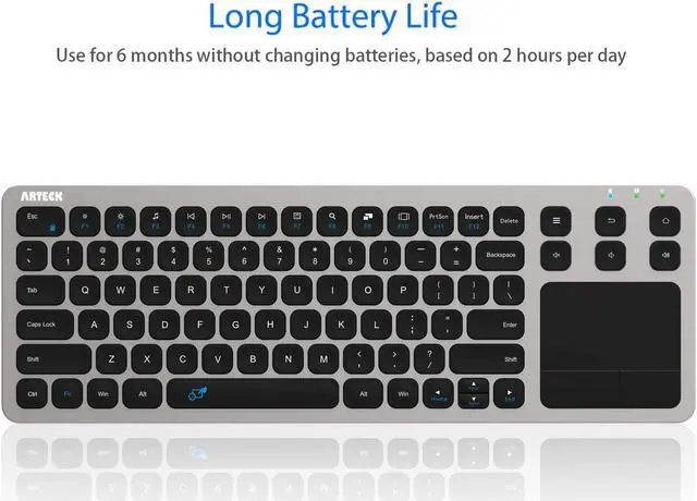 The keyboard works up to 10 meters (33 feet) which allows you to sit in the comfortable couch and use the touch keyboard in the large room. Longer working distance makes the typing more enjoyable and trouble free.