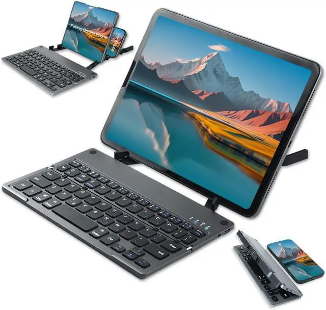 • [Portable Folding Design with Universal Stand] Featuring concertina-fold mechanics and multi-angle stand (9.03*5.24inch unfolded, 0.48inch folded thickness). 2-axis adjustable holder securely fits for Phone for iPhone series, for iPad, for Galaxy Z Fold for Z Flip, and All foldable devices&All Tablet, creating instant mobile workstation.