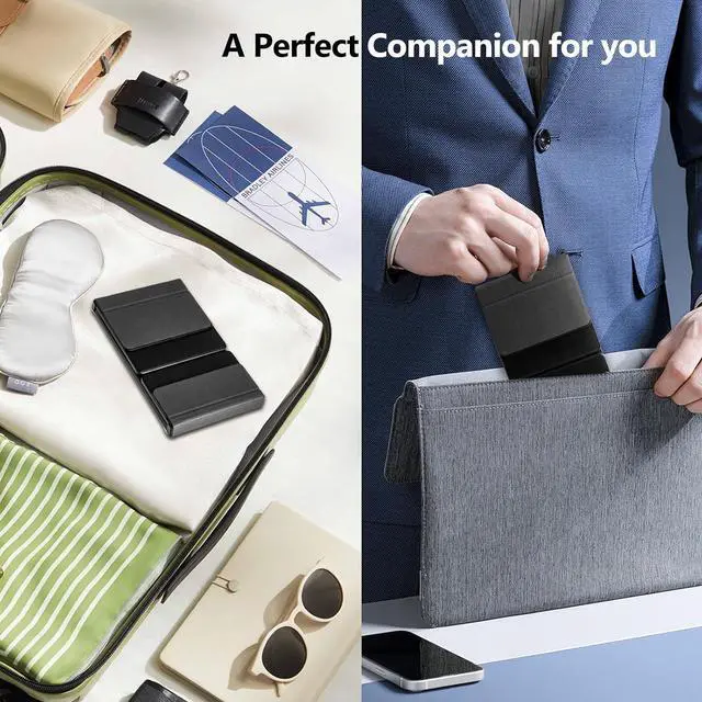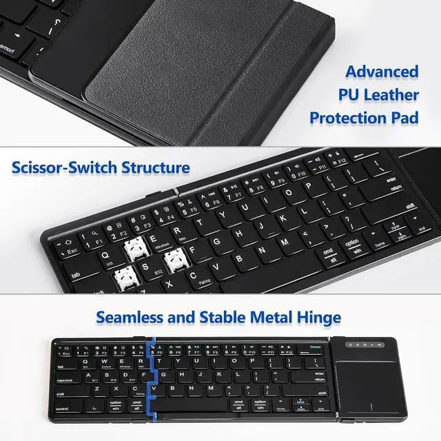 Ultra Slim Tri-Folded Bluetooth Keyboard: The keyboard can be seamlessly triple folded into the ultra slim size7.15in×4.21in×0.64in comparable to a cell phone .The metal joints make for a silky smooth fold that you can easily to put it into your bag or carry around. Do not worry it will take up a lot of space. Only 240g weight, super lightweight but stable. No need to worry about daily wear and scratches which is the best choice for your travel and business trip.