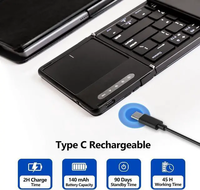 Type-C Rechargeable & Long Lasting Battery: The keyborad with touchpad comes with a TypeC cable, which is compatiable with most devices such as laptop PC or other devices. Upgraded 140mAh large capacity rechargeable battery which allows 2 hours charge and up to 28-days usage 2 hours a dayand a whole week with the touchpad. Perfect work tool for your long trip and business.