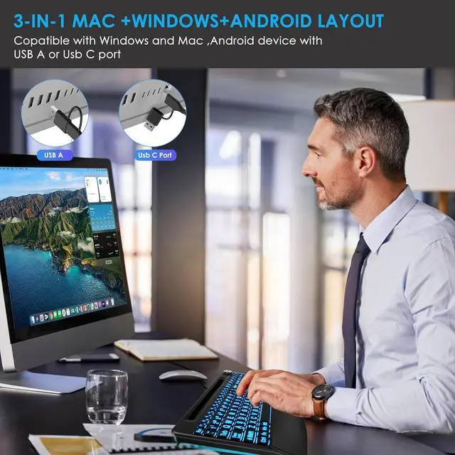 Usb C and Usb A conection & WIDE DEVICE COMPATIBILITY:This USB C &USB A 2 in 1 wired keyboard features plug and play, eliminating the need for charging or battery replacement.Well compatible with windows7/8/10/xVista,Mac OS X10.10 or later. Fits all Type-C or Usb A devices,tablets,cellphones,Macbook pro, iMAC, iMAC Pro,Chromebook and more.(Reminder:Multimedia keys may not be fullly compatiable with Mac OS systems)