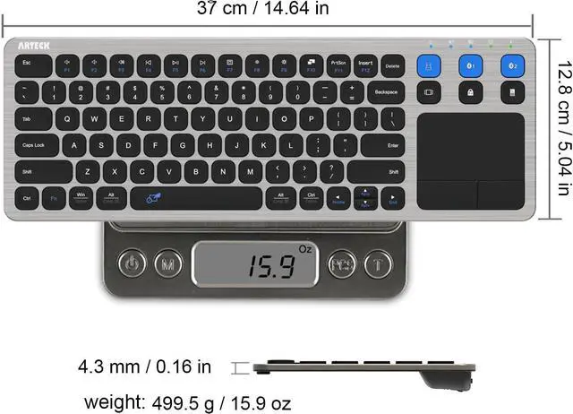 What You Get: Arteck HD197 Wireless Keyboard with Touch Pad, nano USB receiver, charging cable, welcome guide, our 24-months warranty and friendly customer service.