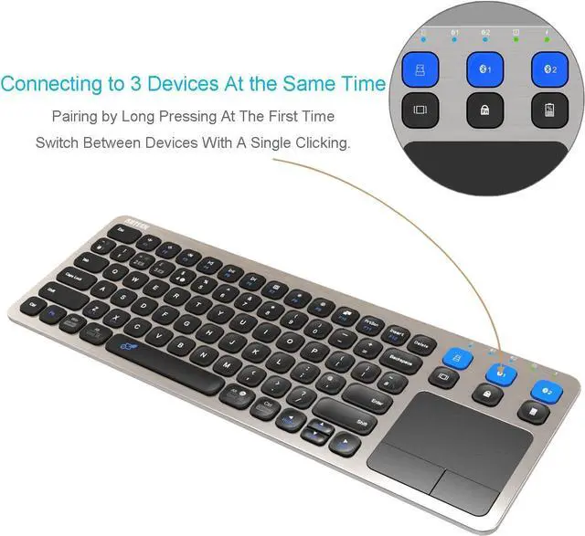 3 Devices Switch with A Single Clicking: This keyboard is able to connect to 3 devices (2.4G USB Wireless + 2 Bluetooth) at the same time. You can switch between 3 devices with a single key clicking.