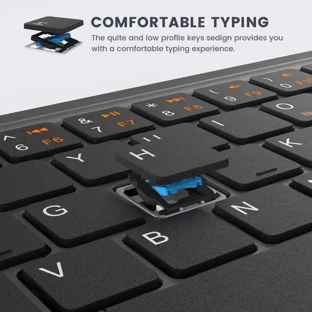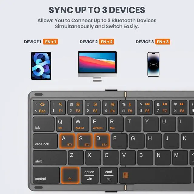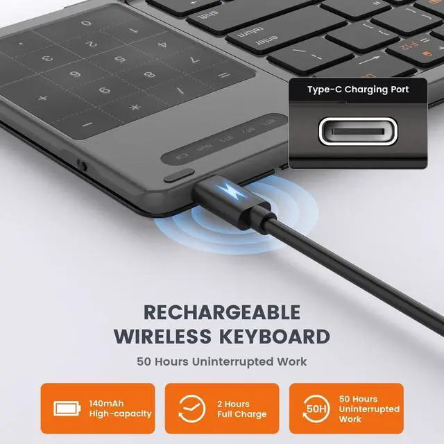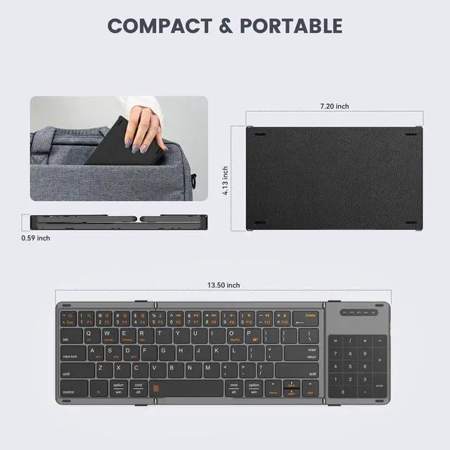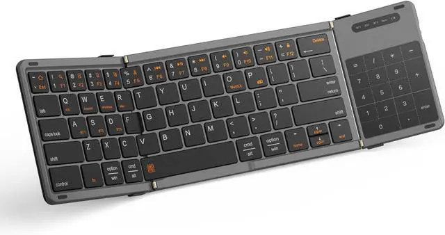 Triple-Folding Portable Bluetooth KeyboardFold it in slide into your work bag or simply stash in your carry-on for business trips. Wherever work takes you, enjoy familiar desktop-style typing on bluetooth keyboard with 2 in 1 touchpad with number pad. Navigate screens and multitask efficiently without packing a separate mouse