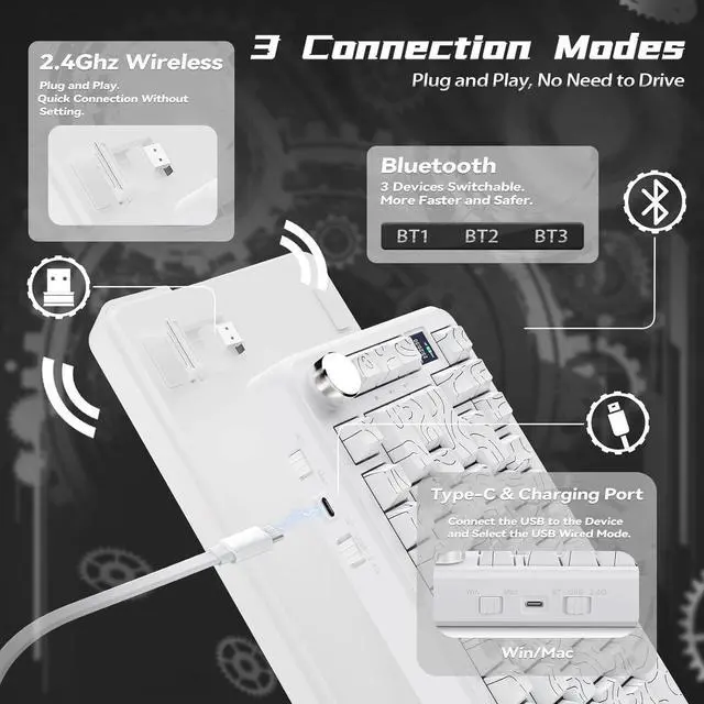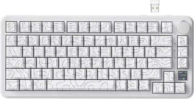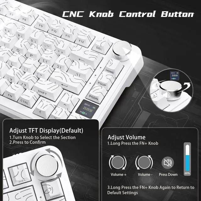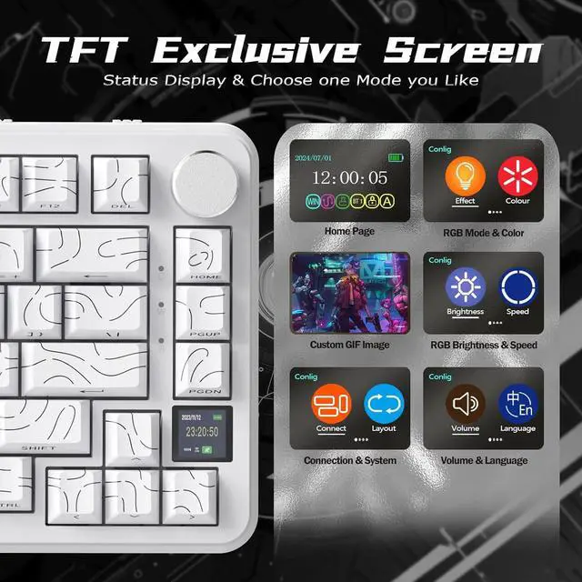 [Tri-Mode Pro Connectivity & Smart Screen Display] Switch effortlessly between Bluetooth 5.0, 2.4GHz wireless, and USB-C modes for seamless multi-device use. The standout 0.85" TFT screen instantly displays battery,time,and connection status and the aluminum knob of the keyboard offers instant control over RGB,volume,or settings. Whats more,you can custom the GIF images in the screen.